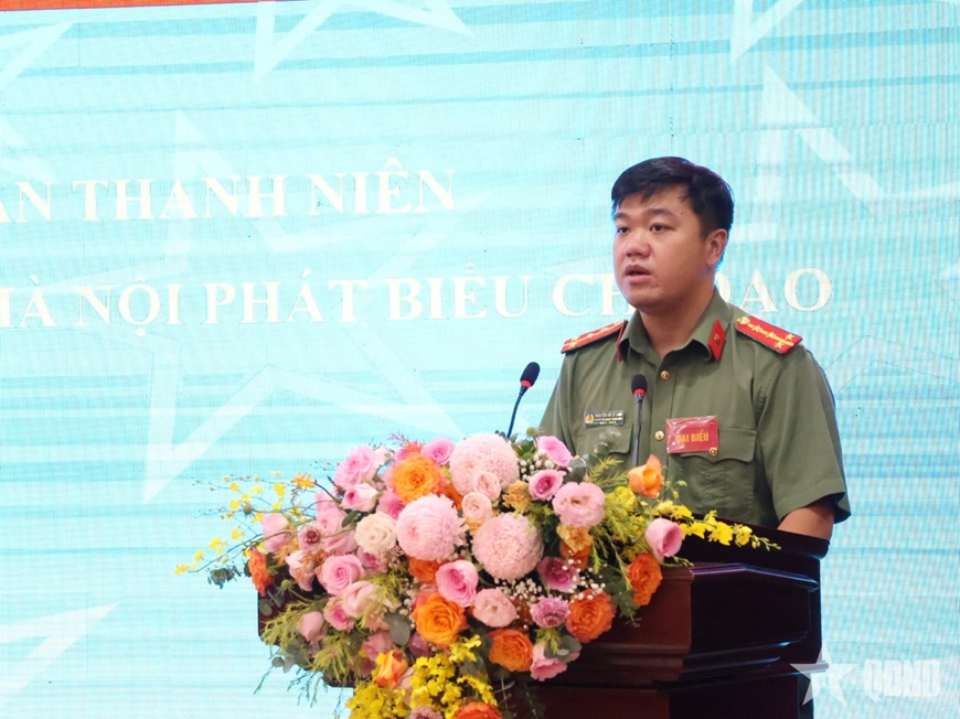 Đại úy Nguyễn Vũ Lê Linh, Phó trưởng Ban Thanh niên Công an TP Hà Nội phát biểu tại đại hội.