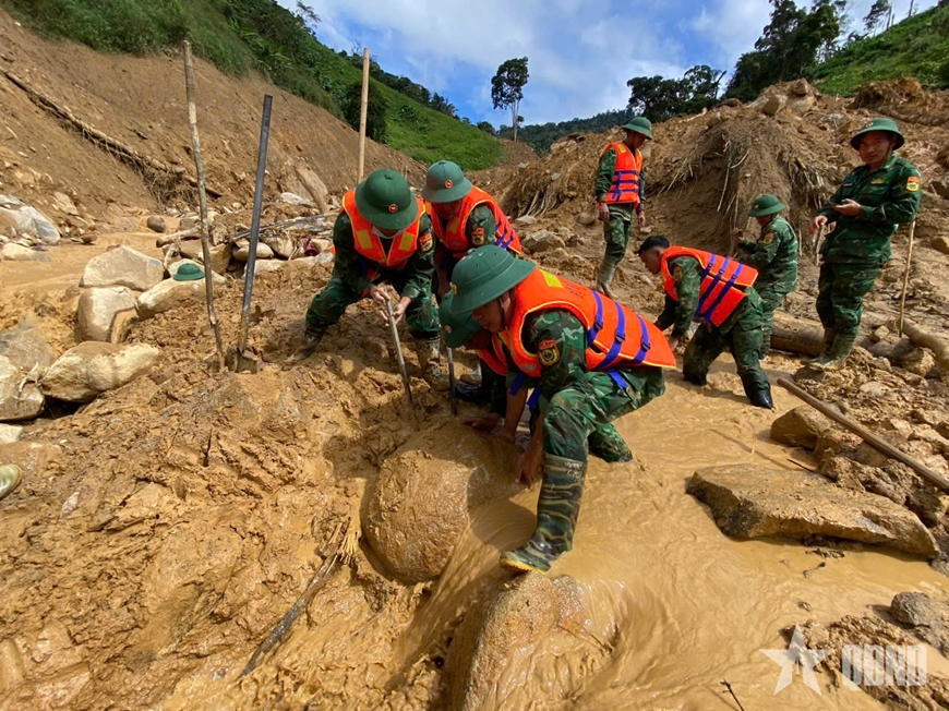 Tại hiện trường, lượng đất đá sạt lở xuống lớn, nhiều khu vực đồi dốc, ta luy dựng đứng nên công tác tìm kiếm người mất tích gặp rất nhiều khó khăn.