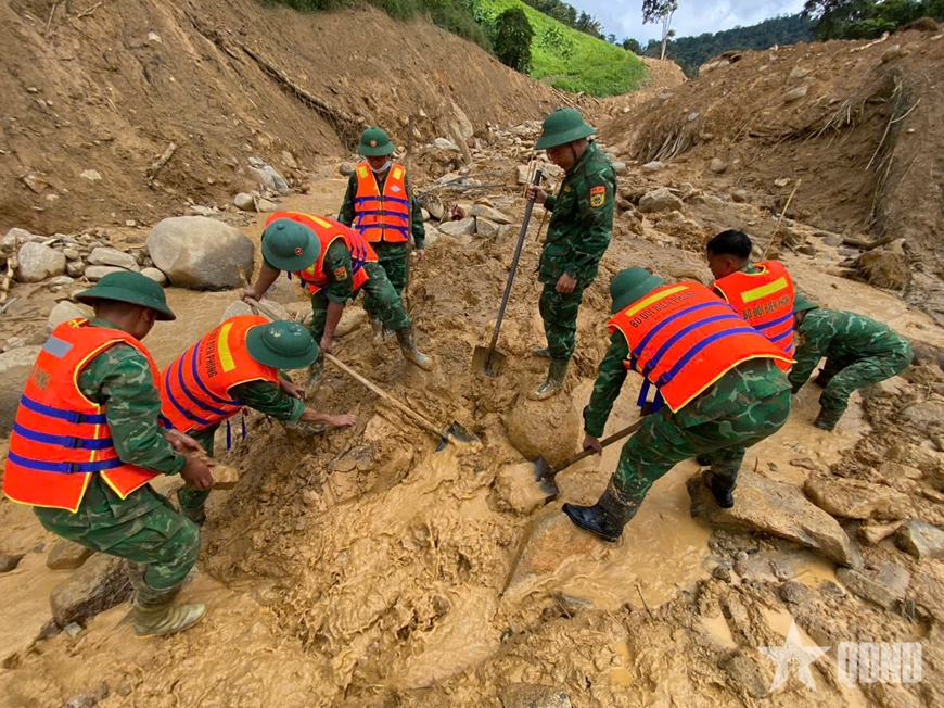 Cán bộ, chiến sĩ Bộ đội Biên phòng TP Đà Nẵng nỗ lực tìm kiếm 2 người mất tích ở thôn Pứt (xã Hùng Sơn, TP Đà Nẵng).
