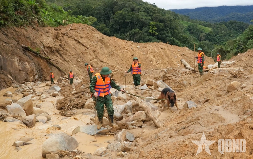 Chó nghiệp vụ của Trường Trung cấp 24 Biên phòng tìm kiếm các vị trí nghi có người bị vùi lấp.