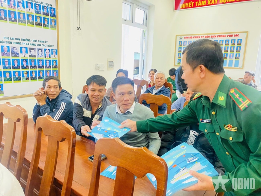 Cán bộ Đồn Biên phòng Phú Lộc phát tờ rơi hướng dẫn ngư dân khai thác hải sản theo quy định của pháp luật.