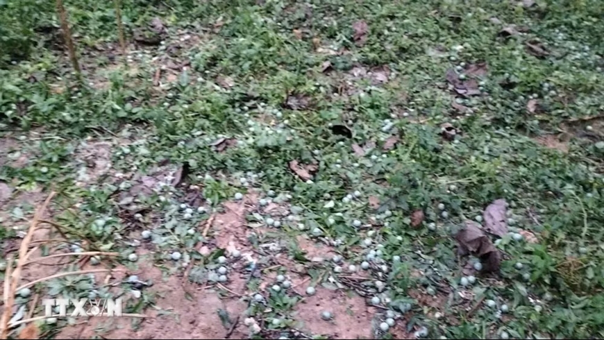 | Mưa đá gây thiệt hại cho vườn mận ở xã Bắc Hà, tỉnh Lào Cai. Ảnh: VietnamPlus |