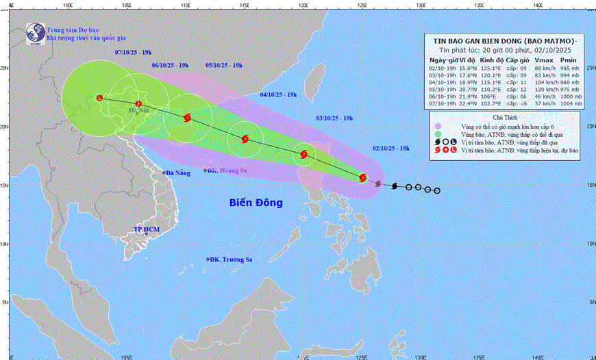 Dự báo, đến 19 giờ ngày 3-10, bão trên vùng biển phía Tây đảo Luzon (Philippines) với sức gió mạnh cấp 9, giật cấp 11; di chuyển theo hướng Tây Tây Bắc với tốc độ 25km/giờ. Khu vực chịu ảnh hưởng là vùng biển phía Đông khu vực Bắc Biển Đông. Cấp độ rủi ro thiên tai cấp 3.