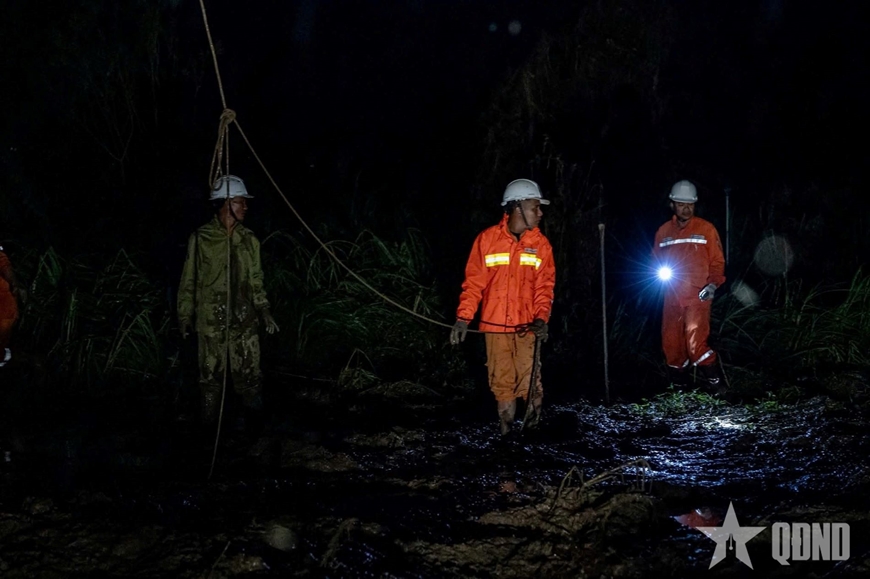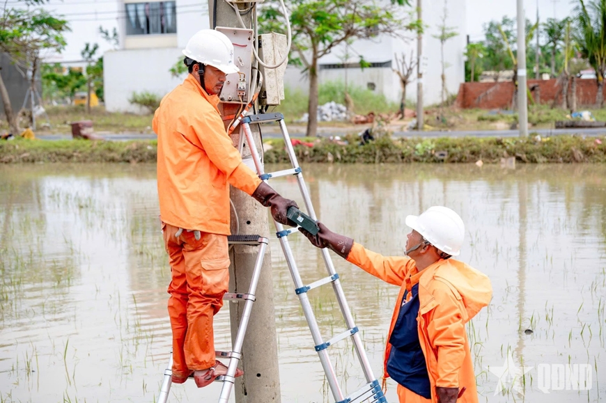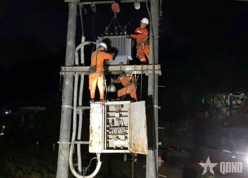 Nhân viên điện lực miền Trung xuyên đêm kiểm tra thiết bị, khắc phục lưới điện sau mưa, lũ.