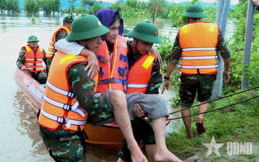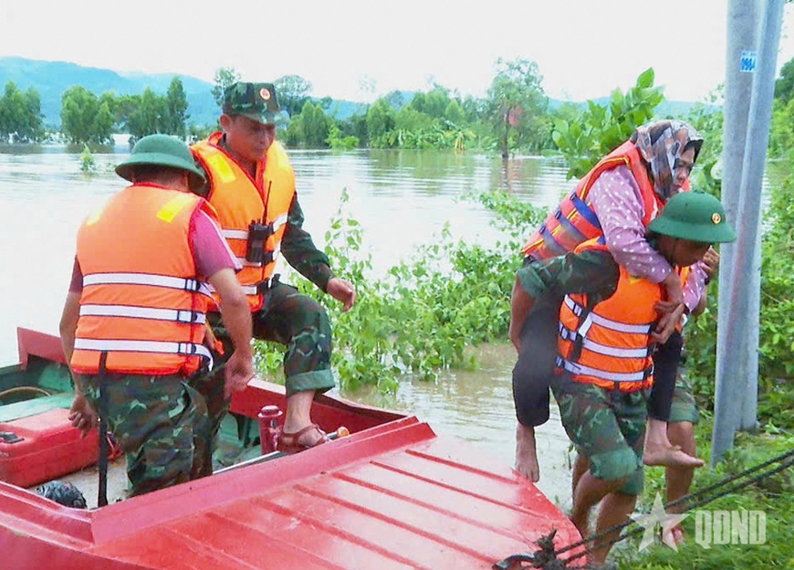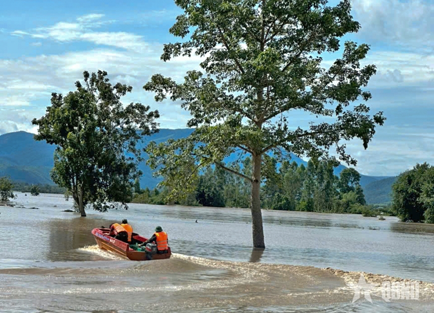 | Cán bộ, chiến sĩ Ban chỉ huy Phòng thủ khu vực 5 - Ayun Pa vượt lũ cứu dân. |