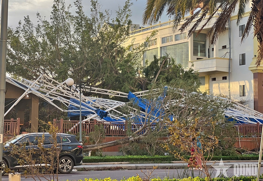 | Cây xanh ngã đổ, mái tôn sập, móp méo, ngổn ngang trên phố. |