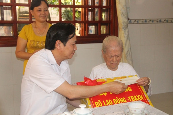 Bộ trưởng Bộ LĐ-TB&XH Đào Ngọc Dung thăm hỏi và tặng quà cho chiến sĩ cách mạng Nguyễn Thị Bích Thủy tại ấp Tân Hùng, xã Tân Thuận Tây, Cao Lãnh, Đồng Tháp. Ảnh: Bộ LĐ-TB&XH.