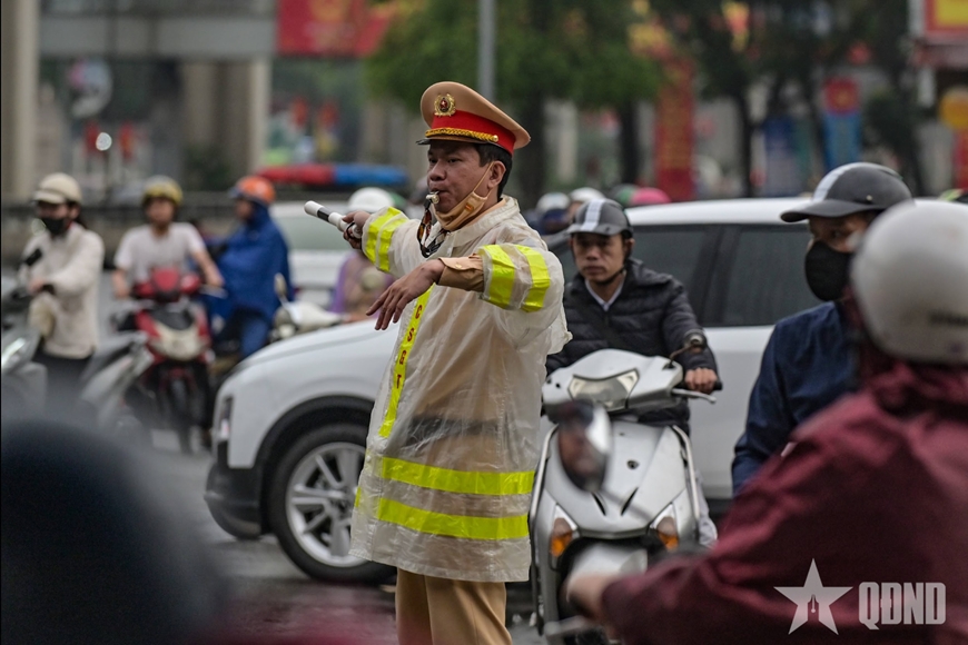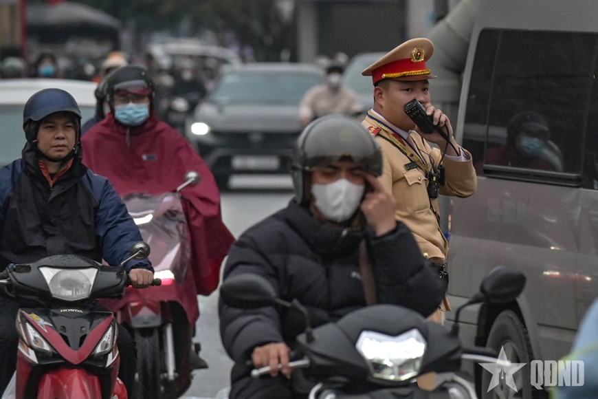 CSGT Hà Nội vất vả điều tiết giao thông trong sáng đầu tuần mưa rét.