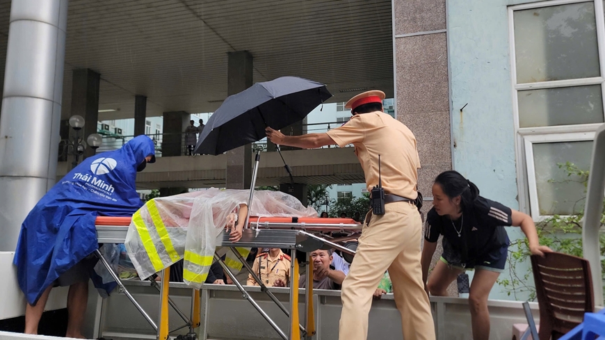 Dưới cơn mưa nặng hạt, nước ngập trắng mặt đường, các chiến sĩ Đội Cảnh sát giao thông (CSGT) đường bộ số 7 (Phòng CSGT Công an TP Hà Nội) đã không ngần ngại ướt người, sẵn sàng lấy áo mưa của mình che chắn cho bệnh nhi mắc bệnh hiểm nghèo đang được đưa đi cấp cứu qua đoạn ngập lụt.