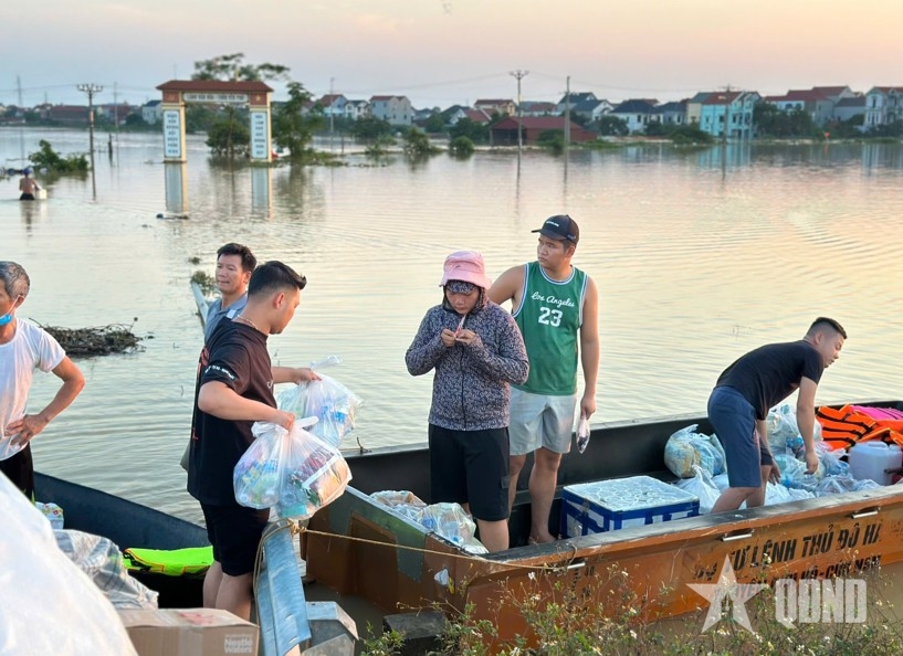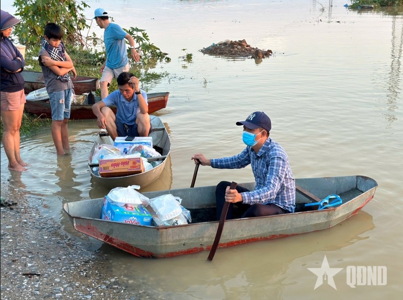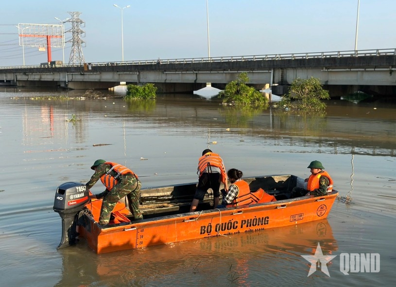 Bộ đội và dân quân địa phương tiếp cận vùng ngập sâu bằng xuồng máy, giúp di chuyển người dân, vận chuyển hàng hóa và nắm tình hình để hỗ trợ kịp thời.