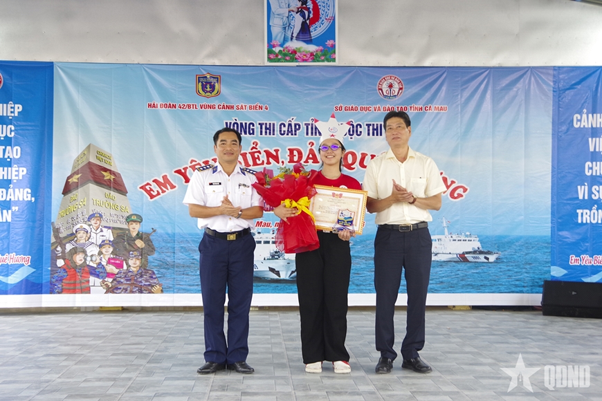 Thượng tá Trịnh Minh Hiển, Bí thư Đảng ủy, Chính ủy Hải đoàn 42 và đồng chí Đặng Trí Thủ, Phó giám đốc Sở Giáo dục và Đào tạo tỉnh Cà Mau trao giải nhất cho em Võ Mai Thùy.