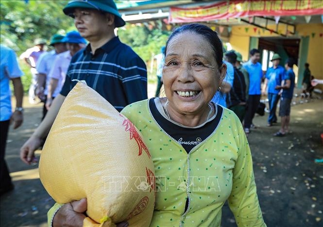 Niềm vui của người dân xóm Rằng khi nhận được gạo hỗ trợ của chính quyền tỉnh Hòa Bình. Ảnh: TTXVN