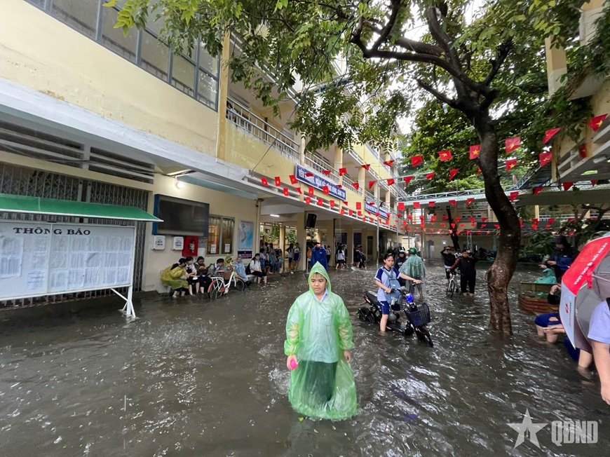| Đợt mưa to ngày 16-10 gây ngập tại Trường THCS Nguyễn Khuyến (Bắc Nha Trang, Khánh Hòa). Ảnh: N.HOÀNG |