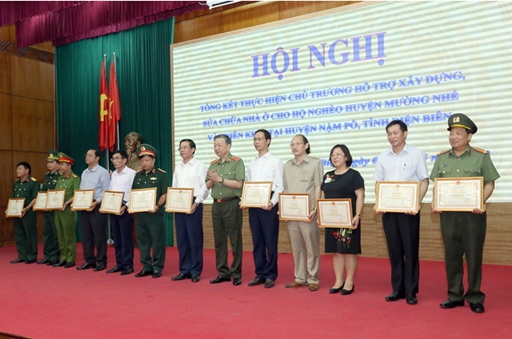 Phát biểu tại buổi làm việc, Đại tướng Tô Lâm đánh giá cao nỗ lực lãnh đạo, chỉ đạo của tỉnh Điện Biên trong việc tổ chức thực hiện chương trình; ghi nhận cố gắng trong rà soát, tham mưu, kiểm tra, phối hợp của Công an tỉnh Điện Biên. Trên cơ sở làm tốt ở huyện Mường Nhé, lực lượng sẽ tiếp tục triển khai ở huyện Nậm Pồ (Điện Biên). Nhân dịp này, Bộ Công an đã tặng bằng khen 5 tập thể, 15 cá nhân; Ủy ban Trung ương MTTQ Việt Nam tặng bằng khen 5 tập thể, 5 cá nhân có thành tích trong thực hiện chương trình làm nhà; Đại tướng Tô Lâm đã trao 10 suất quà tặng người nghèo huyện Mường Nhé; UBND tỉnh Điện Biên cũng tặng bằng khen 13 tập thể, 10 cá nhân có thành tích xuất sắc trong thực hiện chủ trương làm nhà ở cho hộ nghèo huyện Mường Nhé.