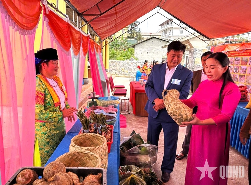 | Đại biểu tham quan gian trưng bày sản phẩm nông nghiệp đặc trưng của hội viên Hội Nông dân xã Khâu Vai bên lề Đại hội. |