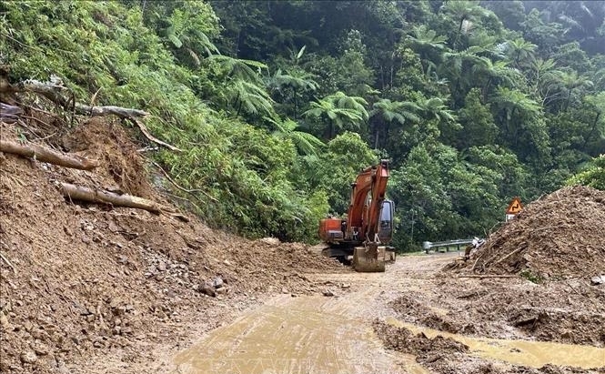 | Điểm sạt lở trên đường Hồ Chí Minh nhánh Tây, địa phận TP Huế được thông xe một làn trong ngày 6-11-2025. Ảnh: TTXVN |