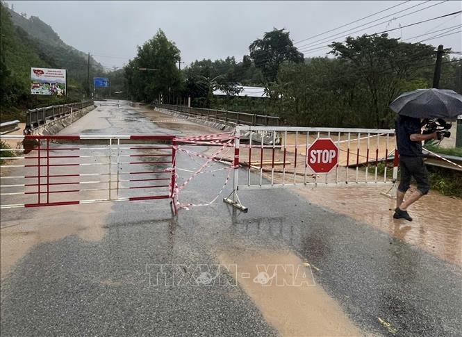 | Lực lượng chức năng đặt rào chắn, cảnh báo cấm phương tiện lưu thông qua cầu. Ảnh: TTXVN |