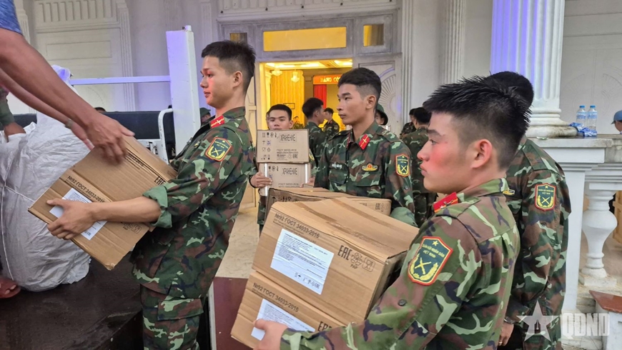 | Bộ CHQS thành phố Huế phân phối hàng viện trợ cho các đơn vị, địa phương. |