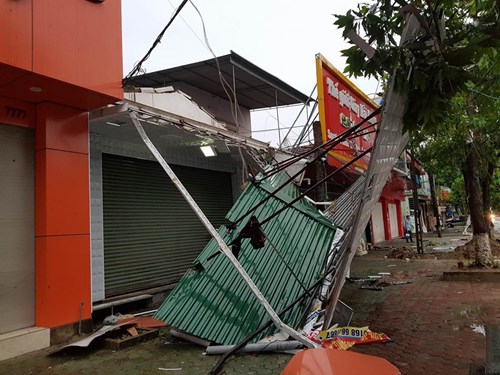 Biển hiệu cửa hàng trên đường Trần Phú, TP Hà Tĩnh bị hư hỏng, rơi xuống trong bão. Ảnh: vietnamnet.vn