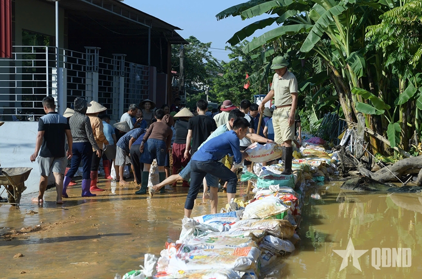 Thượng tá Bùi Xuân Thịnh, Phó sư đoàn trưởng Sư đoàn 3, Quân khu 1 cho biết: “Thực hiện chỉ đạo của cấp trên, ngay từ ngày 6-10, Sư đoàn 3, Quân khu 1 đã huy động từ 600 đến 700 lượt cán bộ, chiến sĩ có mặt tại các điểm xung yếu, cùng nhân dân hộ đê, gia cố bờ sông. Dù thời tiết nắng nóng, các lực lượng vẫn nỗ lực ngày đêm, quyết tâm bảo vệ an toàn tuyến đê và ổn định cuộc sống nhân dân. Dù thực hiện nhiệm vụ với tinh thần khẩn trương, quyết tâm cao nhất nhưng mực nước tiếp tục dâng, nhiều đoạn đê có nguy cơ bị vỡ. Các lực lượng đã triển khai cứu hoa màu giúp dân và chuẩn bị các phương án cứu hộ, cứu nạn tại khu vực ngập sâu".