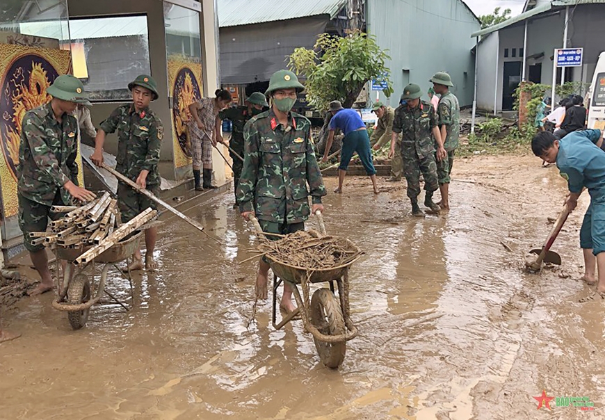Lực lượng vũ trang huyện Sa Thầy giúp nhân dân khắc phục hậu quả mưa lũ. |