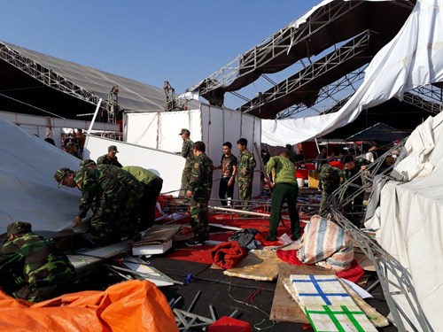 Lực lượng chức năng thành phố Móng Cái giúp các doanh nghiệp dựng lại gian hàng. Ảnh: baoquangninh.com.vn.