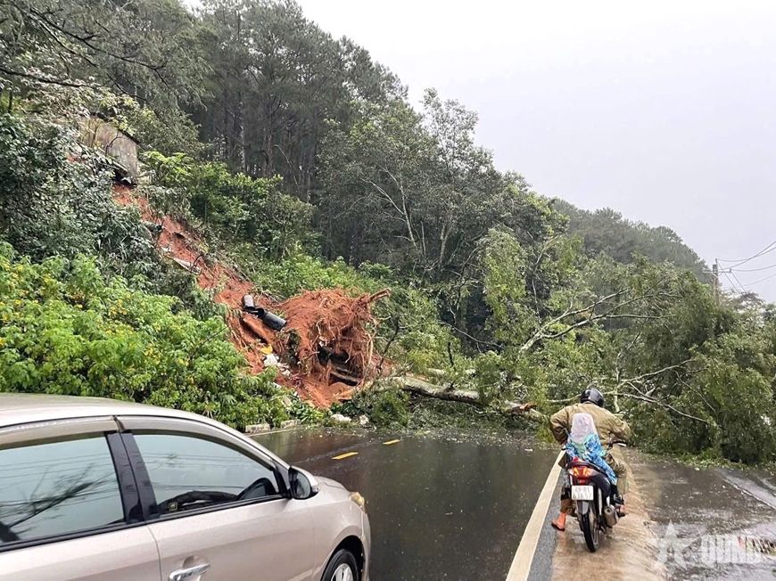 | Cán bộ, chiến sĩ LLVT tỉnh Lâm Đồng tham gia khắc phục sạt lở trên đèo Mimosa. |