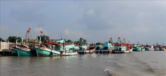 Tàu cá neo đậu tránh trú bão trên sông Cái Bé, xã Bình An, huyện Châu Thành (Kiên Giang). Ảnh: TTXVN |