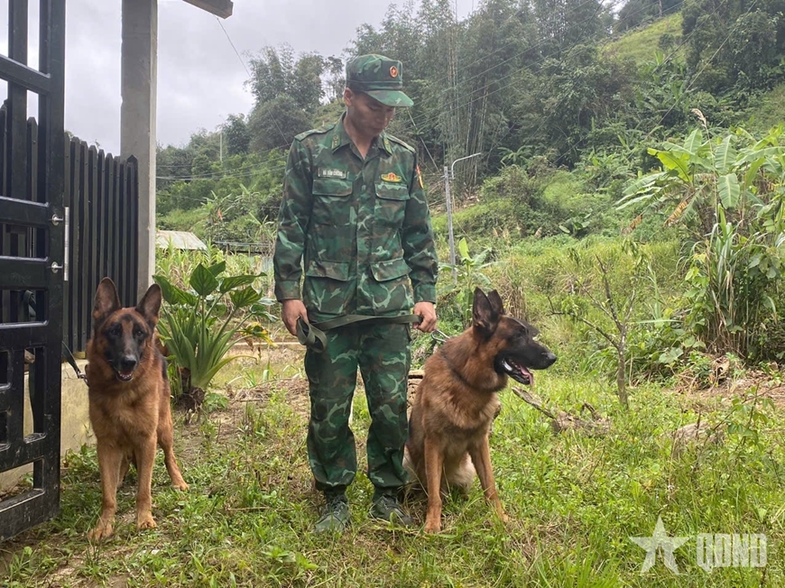 Chó nghiệp vụ của Bộ đội Biên phòng được tăng cường đến xã Hùng Sơn sẵn sàng làm nhiệm vụ.