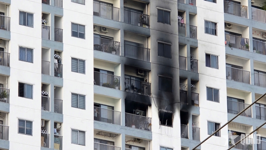 Theo ghi nhận tại hiện trường, ngọn lửa khởi phát từ bên trong căn hộ rồi lan rộng, khiến những cột khói đen đặc quánh kèm theo khói trắng bốc cao nghi ngút. Khói tràn qua ban công, ám đen cả một dải dọc bề mặt các tầng phía trên của tòa nhà.