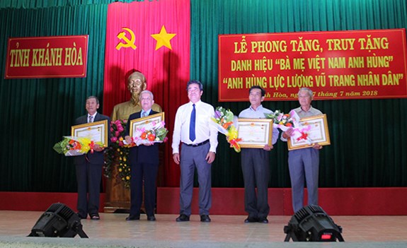 QĐND Online – Sáng 27-7, UBND tỉnh Khánh Hòa đã tổ chức lễ đón nhận danh hiệu Anh hùng lực lượng vũ trang nhân dân (AHLLVTND) truy tặng cho 4 liệt sĩ và danh hiệu Bà mẹ Việt Nam Anh hùng truy tặng, phong tặng cho 35 mẹ (trong đó có 3 mẹ còn sống) trên địa bàn tỉnh. Ông Lê Thanh Quang, Ủy viên Trung ương Đảng, Bí thư tỉnh ủy Khánh Hòa dự, chỉ đạo buổi lễ.