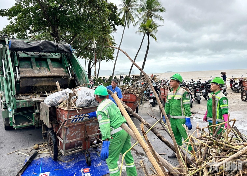 Theo lãnh đạo Công ty Cổ phần Môi trường Đô thị Nha Trang, ngoài hàng chục tấn rác thải sinh hoạt như chăn, màn, quần áo, bàn ghế hư hỏng... đang được khẩn trương thu dọn tại các khu vực ngập lụt ở 4 phường Nha Trang, dọc bãi biển đường Trần Phú còn có hàng trăm tấn rác các loại đang được huy động lực lượng tham gia dọn dẹp. Dự kiến, phải mất khoảng hai đến ba ngày nữa thì lượng rác thải dọc bãi biển mới cơ bản được thu dọn hết.