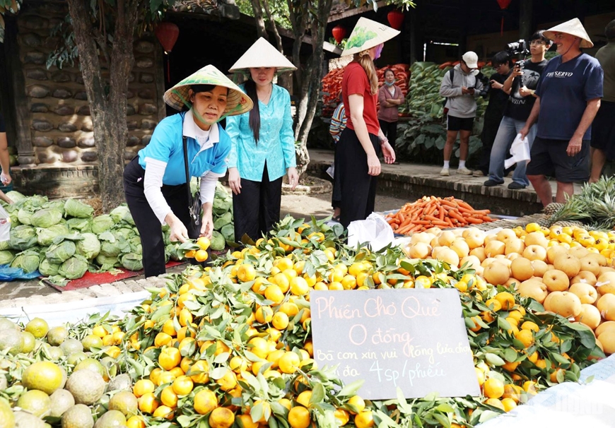 | Du khách tham gia trải nghiệm “Phiên chợ quê 0 đồng”. |