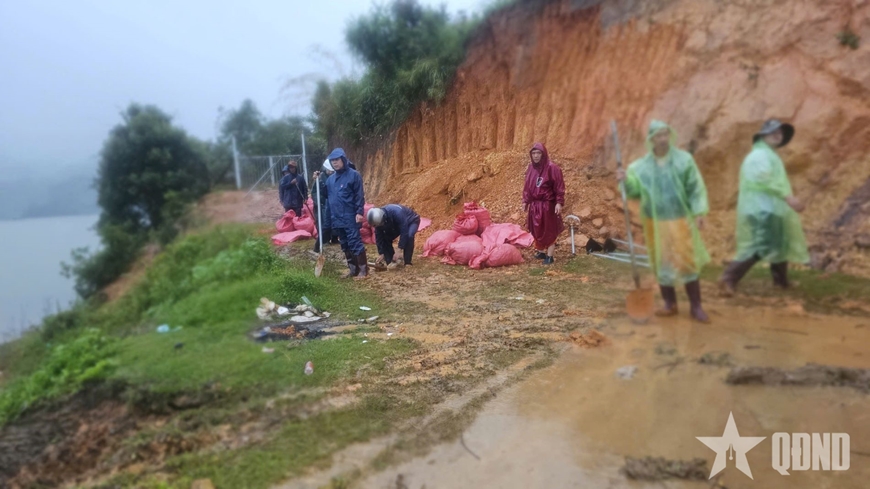 | Các lực lượng kiểm tra, khắc phục sự cố tại hồ Cay An chiều 7-11. |