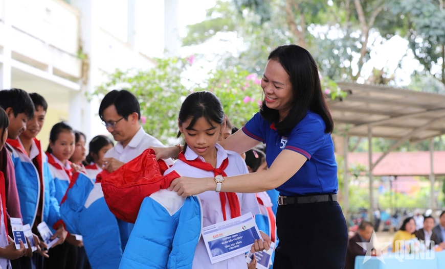 | Báo Sài Gòn Giải Phóng tặng áo ấm cho học sinh trên địa bàn xã Tà Năng, tỉnh Lâm Đồng. |