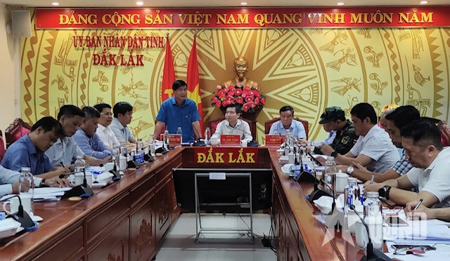 | Tỉnh Đắk Lắk tổ chức cuộc họp tại Sở Chỉ huy tiền phương ứng phó với bão. |