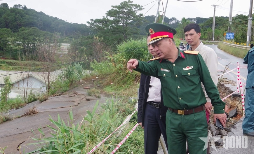 Đại tá Đinh Hồng Tiếng, Chỉ huy trưởng Bộ CHQS tỉnh Lâm Đồng kiểm tra tình hình sạt lở tại đường Bidoup, xã Lạc Dương.