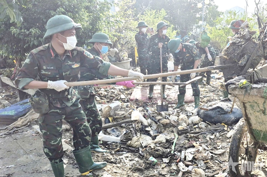 | Cán bộ, chiến sĩ LLVT TP Huế thu gom, xử lý rác. |