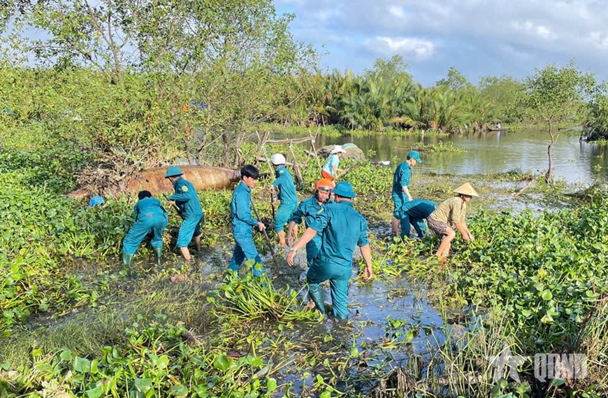 | Lực lượng dân quân xã Đan Điền (TP Huế) vớt bèo, khơi thông dòng chảy tại thôn Cư Lạc. |