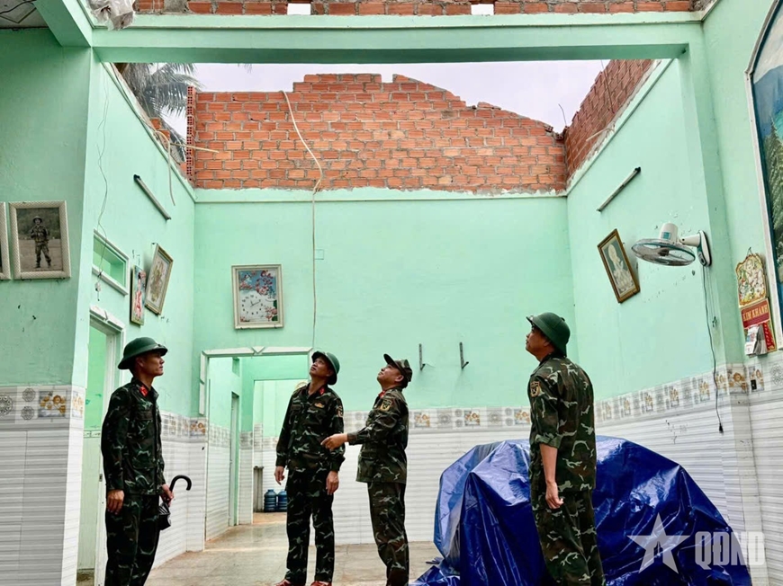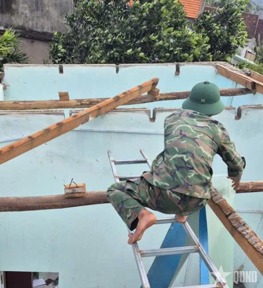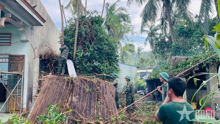 Cán bộ, chiến sĩ Lữ đoàn 572 (Quân khu 5) giúp gia đình ông Đoàn Văn Trọng lợp lại mái tôn, thu gom rác thải, cây cối gãy đổ sau bão.