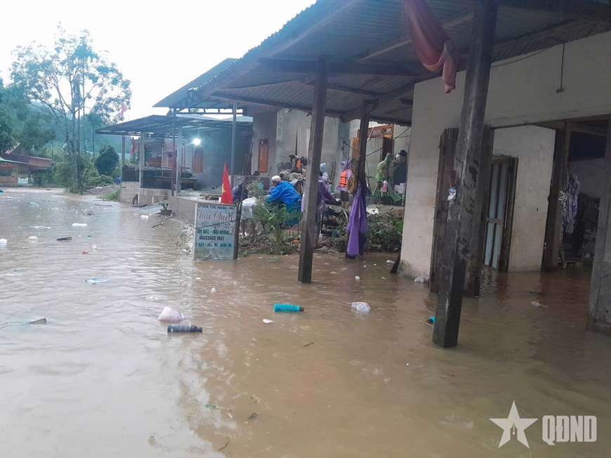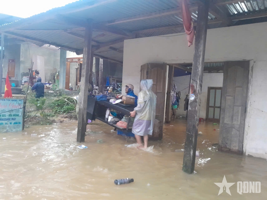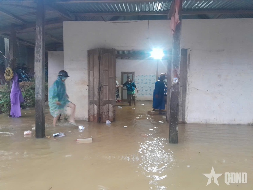 | Sáng 28-10, nước tràn bờ kè trung tâm xã Avương gây ngập lụt nhà dân tại thôn Azứt. Các lực lượng hỗ trợ người dân di dời đồ đạc lên vị trí cao. |
