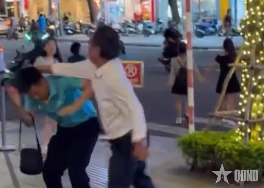 Người đàn ông mặc áo sơ mi trắng cầm điện thoại đánh nhiều lần vào mặt, đầu tài xế taxi, khiến nạn nhân ngã xuống đường.