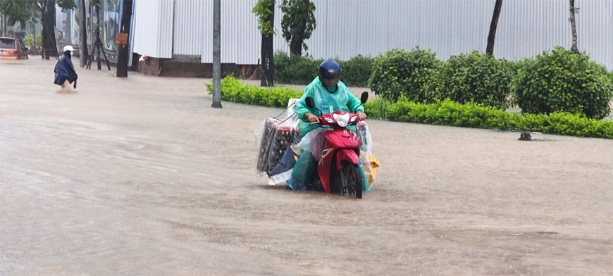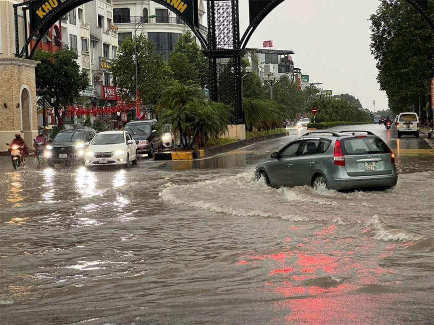 Khu vực Geleximco nhiều tuyến đường bị ngập úng cục bộ, giao thông đi lại khó khăn. |