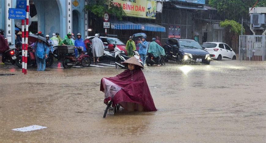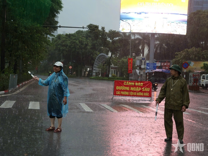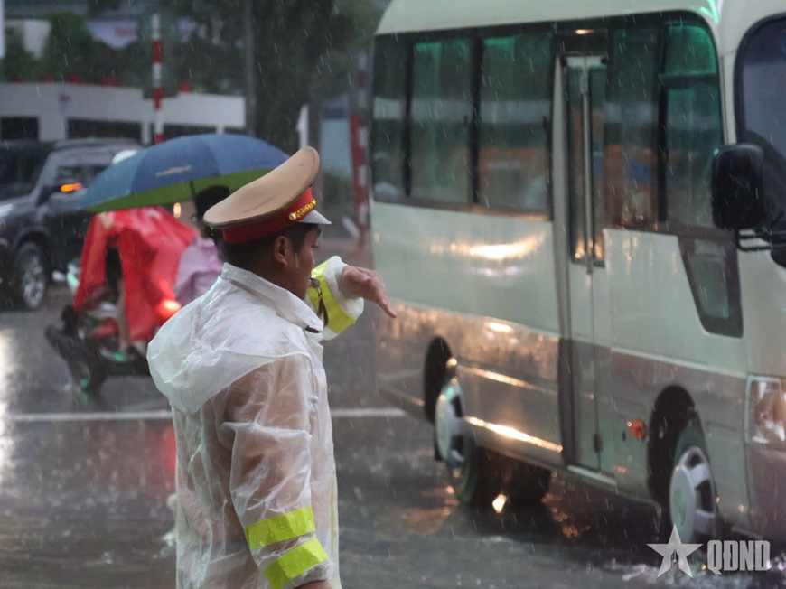Cảnh sát giao thông giúp phân luồng và hỗ trợ người dân vượt qua khu vực ngập lụt. |