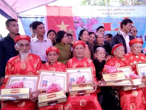 Mừng thọ người cao tuổi đầu Xuân cũng đã trở thành nét văn hóa kính già, trọng lão trong đạo lý sống của người dân Việt Nam. Truyền thống tốt đẹp đó đã và đang nhân lên những giá trị tinh thần quý báu, mang ý nghĩa thiết thực và tính nhân văn sâu sắc nhằm phát huy vai trò “cây cao bóng cả” của người cao tuổi trong gia đình và toàn xã hội.Thôn Dương Cốc, xã Đồng Quang (huyện Quốc Oai, TP Hà Nội) tổ chức chúc thọ các cụ trong thôn.