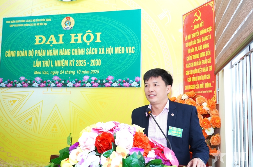 Phát biểu chỉ đạo tại đại hội, ông Đỗ Ngọc Tuấn, Phó giám đốc NHCSXH tỉnh Tuyên Quang, đánh giá cao kết quả đạt được của Công đoàn bộ phận Phòng giao dịch NHCSXH Mèo Vạc trong nhiệm kỳ qua; đồng thời đề nghị công đoàn tiếp tục phát huy tinh thần đoàn kết, xây dựng tập thể vững mạnh; chú trọng công tác phát triển Đảng trong đoàn viên; đẩy mạnh các phong trào thi đua yêu nước, bám sát nhiệm vụ chính trị của đơn vị và chỉ đạo của công đoàn cấp trên, phấn đấu hoàn thành xuất sắc các mục tiêu nhiệm kỳ 2025-2030.
