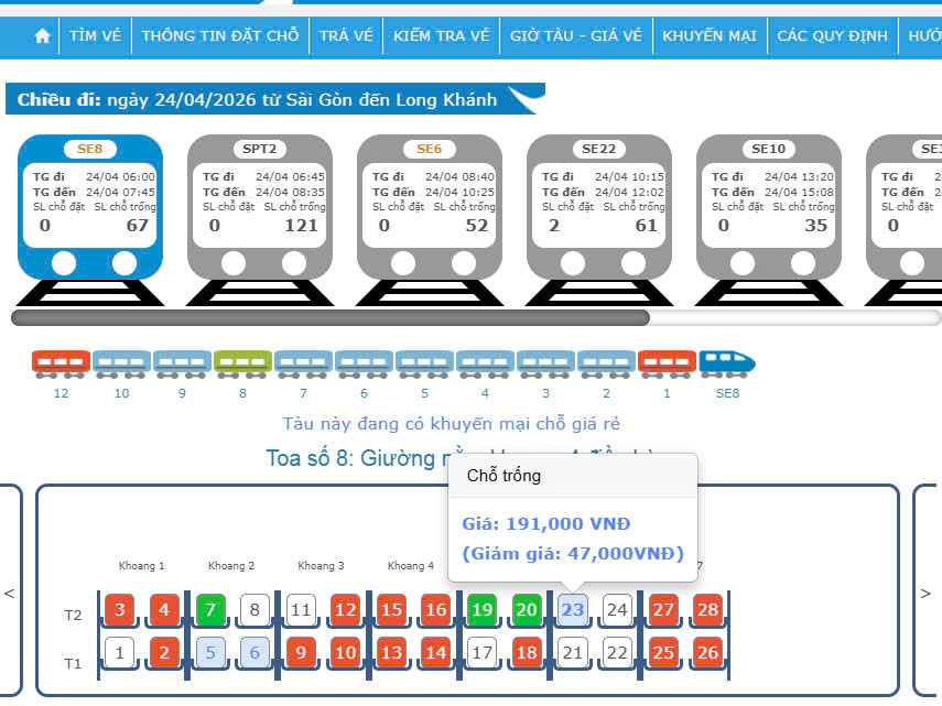 Chương trình đang áp dụng thí điểm cho các đoàn tàu SE5, SE6, SE7, SE8 trong thời gian từ nay đến hết ngày 15-5-2026, sau đó sẽ được triển khai rộng rãi trên các đoàn tàu khác. Các vị trí giường nằm hoặc ghế ngồi có giá ưu đãi được hiển thị chữ số màu xanh nhạt trên hệ thống, giúp hành khách dễ dàng nhận biết và lựa chọn.