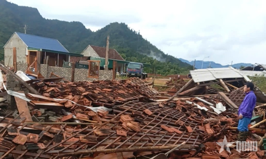 Chiều 5-10, đồng chí Nguyễn Thị Hoài, Chủ tịch UBND xã Thông Thụ (tỉnh Nghệ An) cho biết, trên địa bàn xảy ra mưa to, gió lốc làm đổ sập hoàn toàn hai ngôi nhà kiên cố của các hộ dân, nhiều nhà khác bị tốc mái.