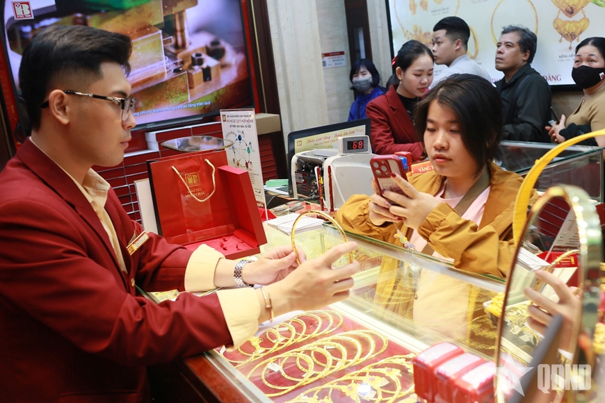Chiều 25-2 (tức mồng 9 Tết Nguyên đán Bính Ngọ), một ngày trước Ngày Vía Thần tài, tại các cửa hàng vàng tại Hà Nội, không khí người dân đi giao dịch vàng rất tấp nập.