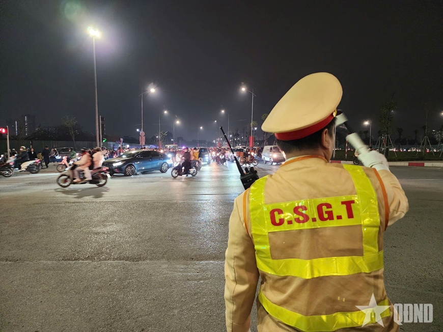 | Do mật độ người và phương tiện tại khu vực Sân vận động quốc gia Mỹ Đình tăng cao đột biến, lực lượng chức năng tổ chức phân luồng giao thông qua khu vực. |